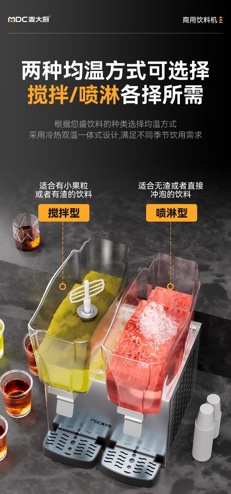 首頁 > 商廚產品 > 制冰機 > 商用飲料機 >麥大廚220V標準款雙缸單冷噴淋式飲料機商用235W