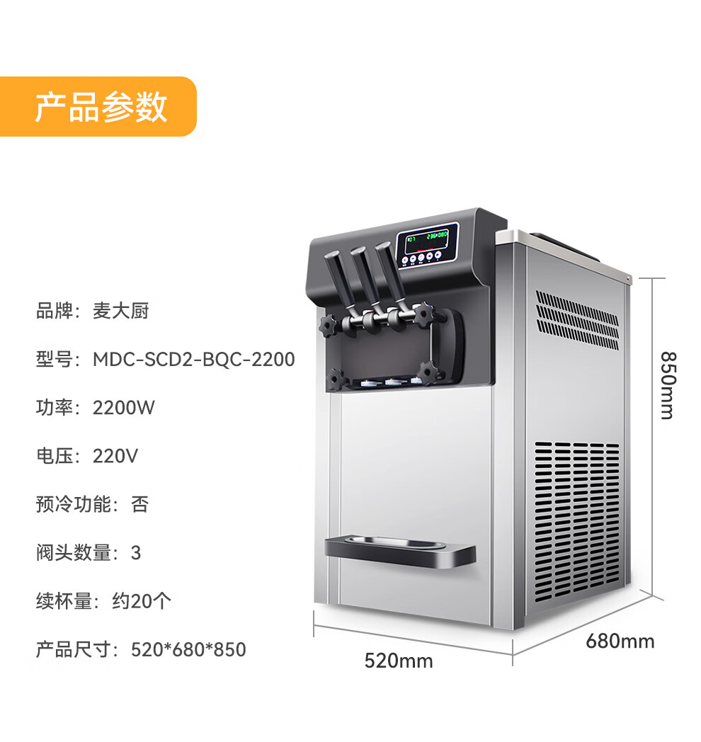 麥大廚經(jīng)濟款三頭臺式冰淇淋機2.2KW