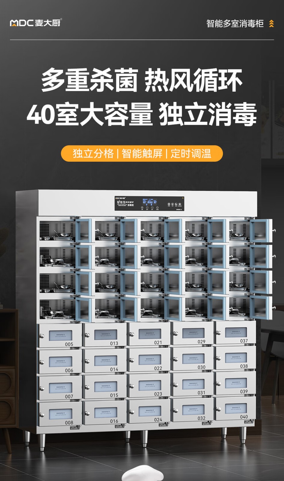 首頁(yè) > 商廚產(chǎn)品 > 消毒柜 > 格子消毒柜 >麥大廚40室智能觸屏型熱風(fēng)循環(huán)中溫消毒柜4.5KW